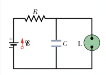 The fluorescent lamp L of negligible capacitance is connected in parallel across the capacitor C of an R C circuit.