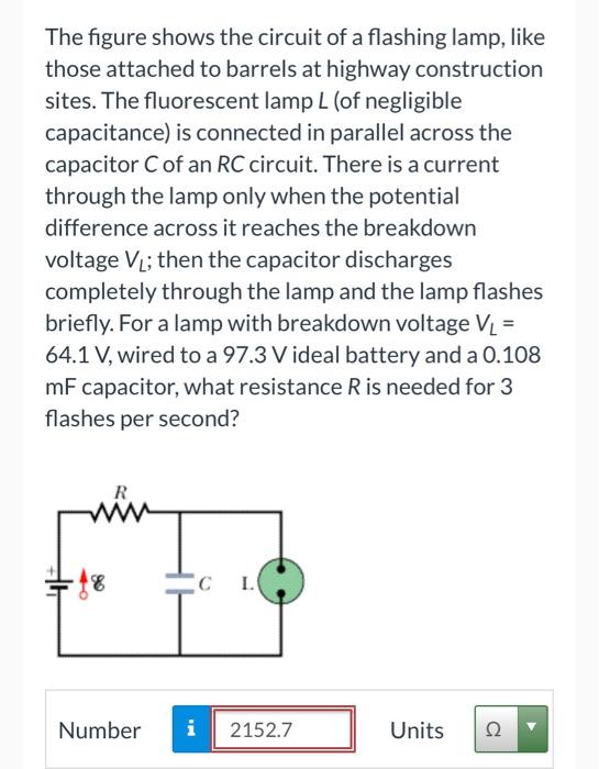 Figure 27 64 shows the circuit of a flashing lamp like those attached to barrels at highway construction sites. Figure shows the circuit of a flashing lamp like those attached The fluorescent lamp L of negligible capacitance is connected in parallel across the capacitor C of an RC circuit. Figure shows the circuit of a flashing lamp like thoseattached to barrels at highway construction sites.